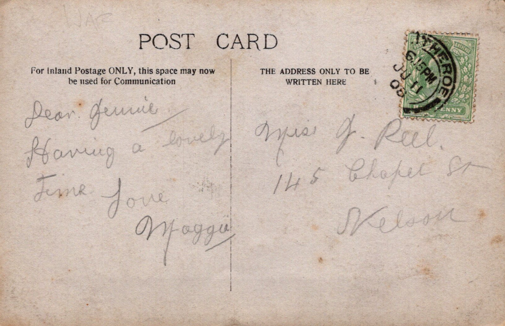 Postcard size: Standard. Posted in 1908