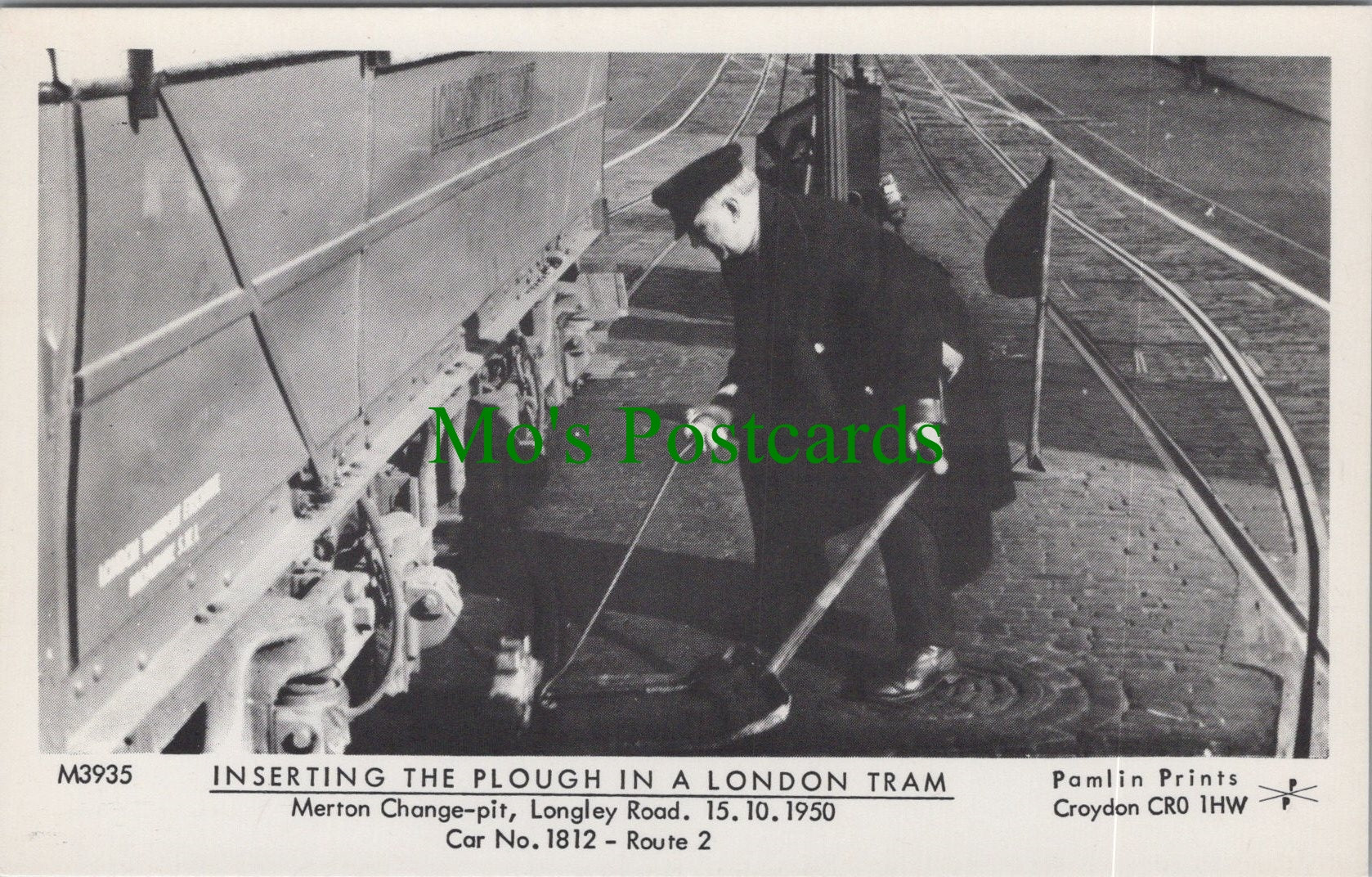 This is a London Postcard - Inserting The Plough in a London Tram. Merton Change-Pit, Langley Road. 15.10.1950. Car No 1812 - Route 2 - SW11746