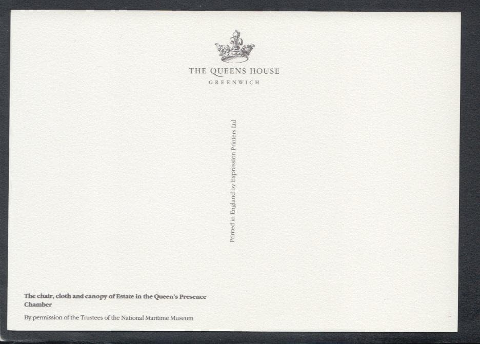 Mo's Postcards offers for sale a postcard of The Queen's House, Greenwich, London. The Chair, Cloth and Canopy of Estate in The Queen's Presence Chamber.