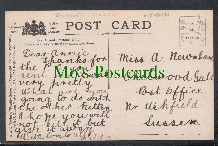 W & A.Gilbey's, Gilberts Stores, London. A wines and spirits shop (off licence). This is a fantastic standard sized postcard which would be a great addition to your postcard collection. Published by A & G.Taylor's "Reality Series".
