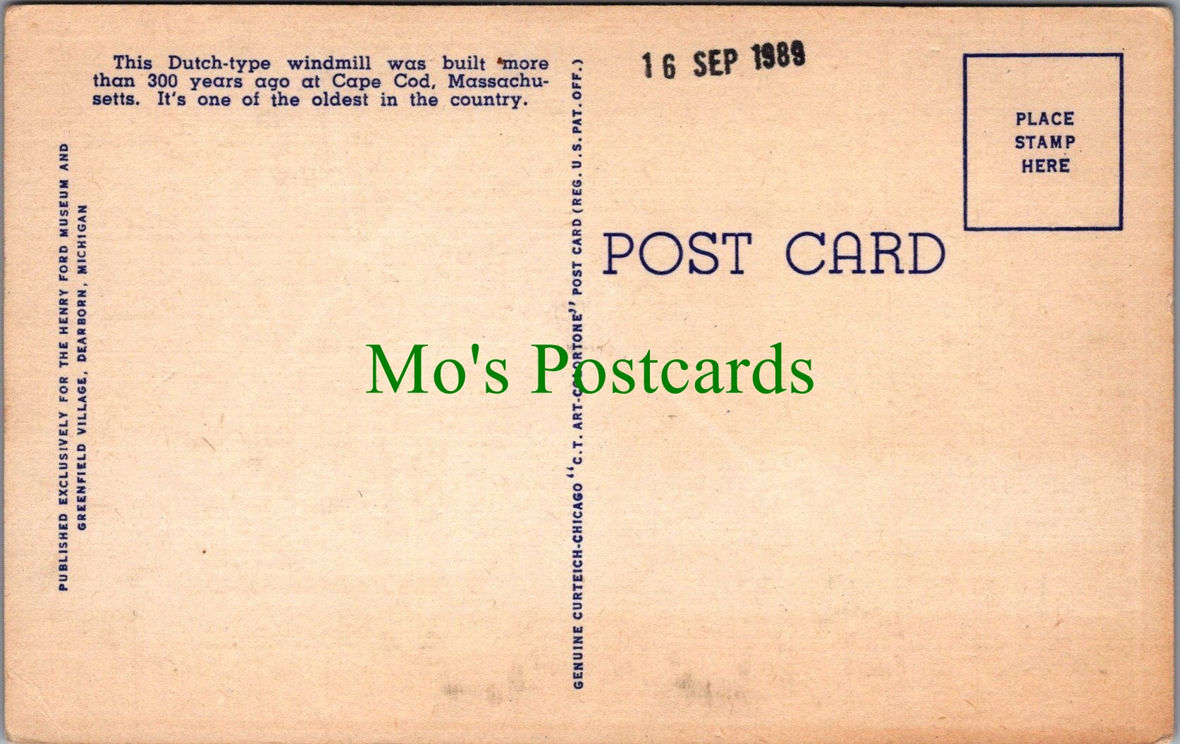 Mo's Ref:  America Postcard - Cape Cod Windmill, Greenfield Village, Dearborn, Michigan Ref.SW10125