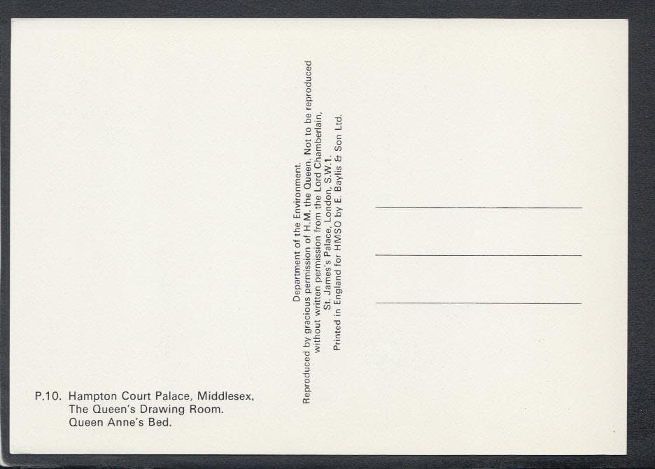 Mo's Postcards offers for sale a postcard of Hampton Court Palace, Middlesex. The Queen's Drawing Room. Queen Anne's Bed.