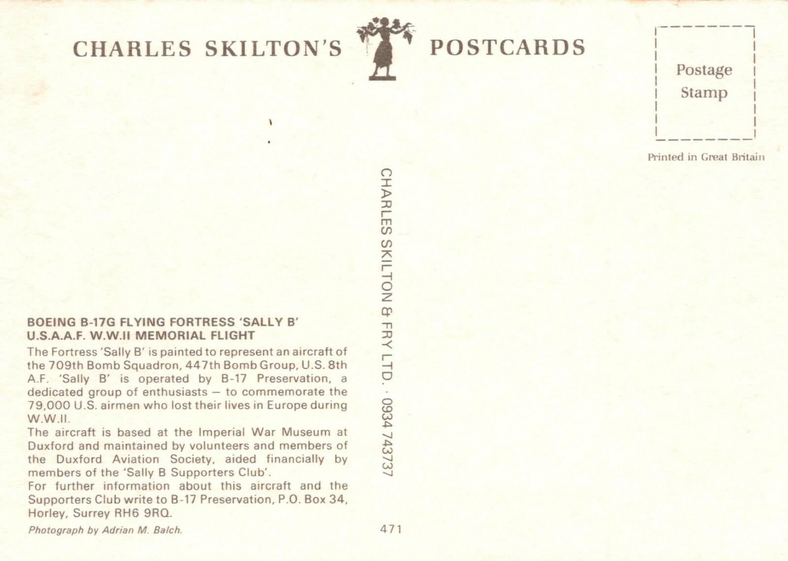 Postcard Description: Military Aviation Postcard - Boeing B-17G Flying Fortress Aeroplane 'Sally B' - WWII Memorial Flight