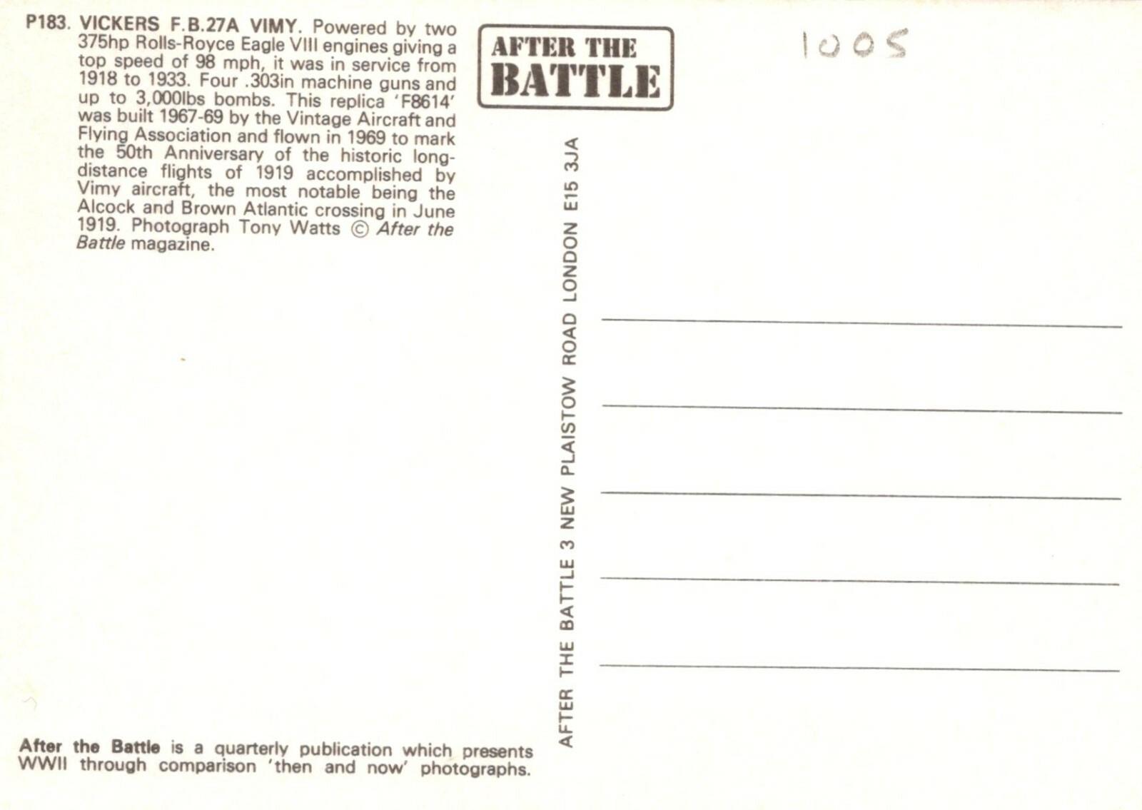 Postcard Description: Military Aviation Postcard - Vickers F.B.27A Vimy Aeroplane