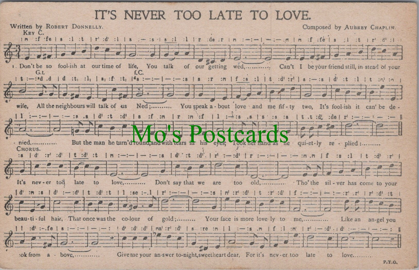 Mo's Ref: Music Postcard - Musical Notes, It's Never Too Late To Love, Aubrey Chaplin Ref.HP316