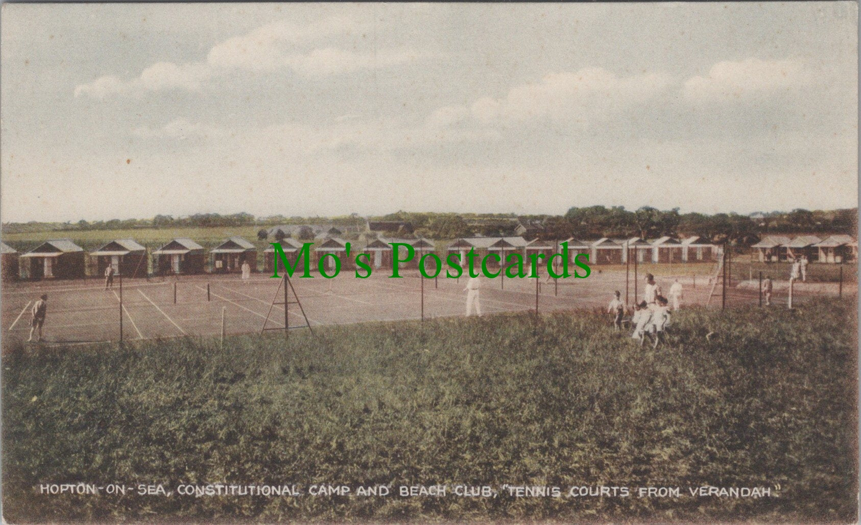 This is a postcard of Constitutional Camp, Hopton-On-Sea, Norfolk. Tennis Courts From Verandah