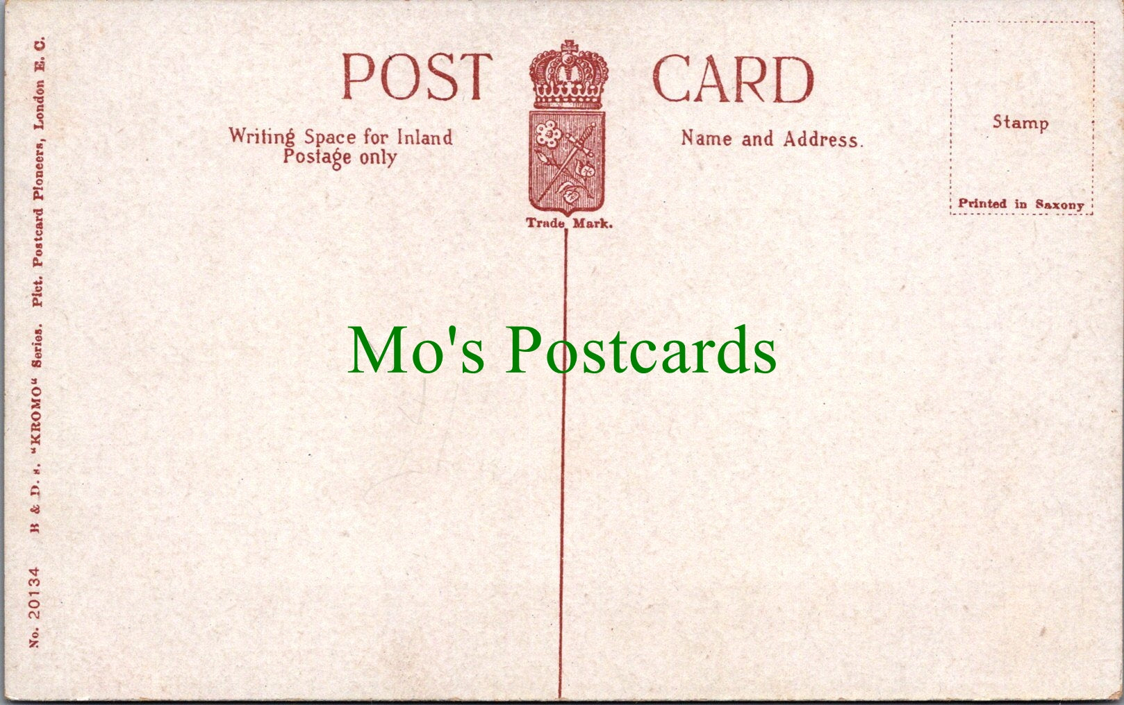 All of our postcards are posted to you inside a plastic sleeve and a board backed envelope which will be marked 'Please do not bend'. The 'Mo's Postcards' watermark does not appear on the actual postcard'.