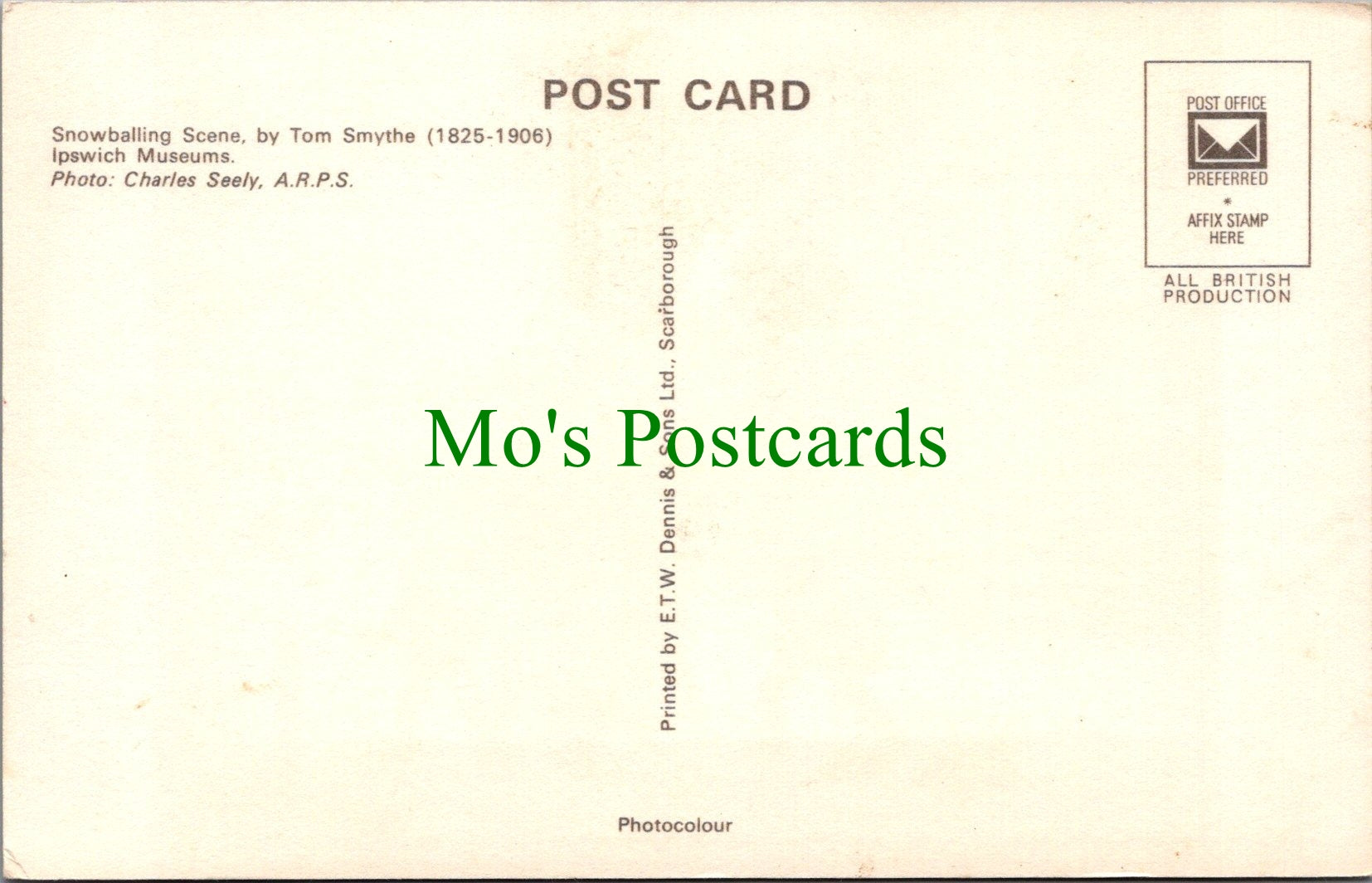Snowballing Scene By Tom Smythe. Ipswich Museum. This is a fantastic standard sized postcard which would be a great addition to your postcard collection. Published by E.T.W.Dennis & Sons Ltd.