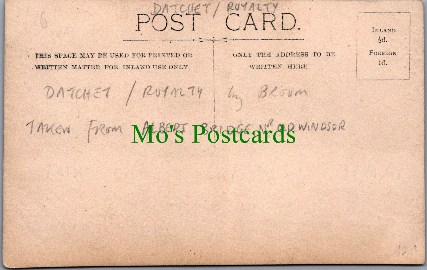 All of our postcards are posted to you inside a plastic sleeve and a board backed envelope which will be marked 'Please do not bend'. The 'Mo's Postcards' watermark does not appear on the actual postcard'.