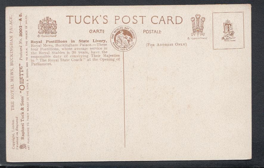 London Postcard - Royal Postillions in State Livery, The Royal Mews, Buckingham