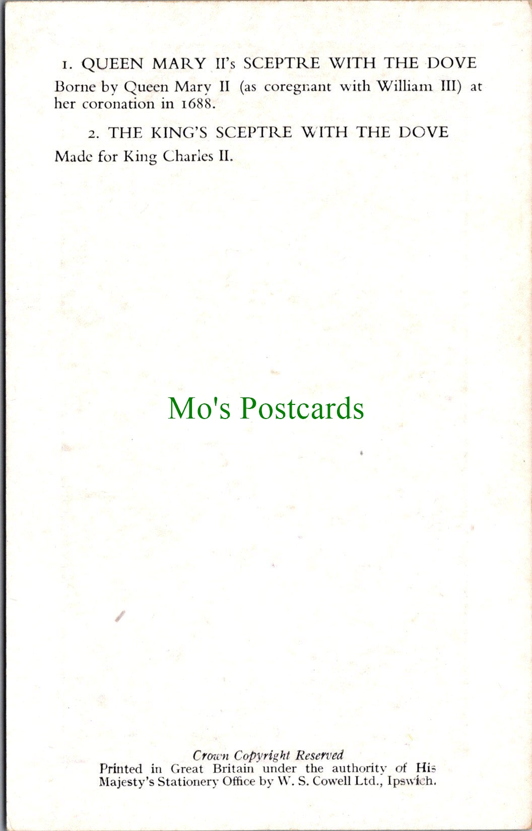 This is a Royalty Postcard - Queen Mary II's Sceptre With The Dove, and The King's Sceptre With The Dove