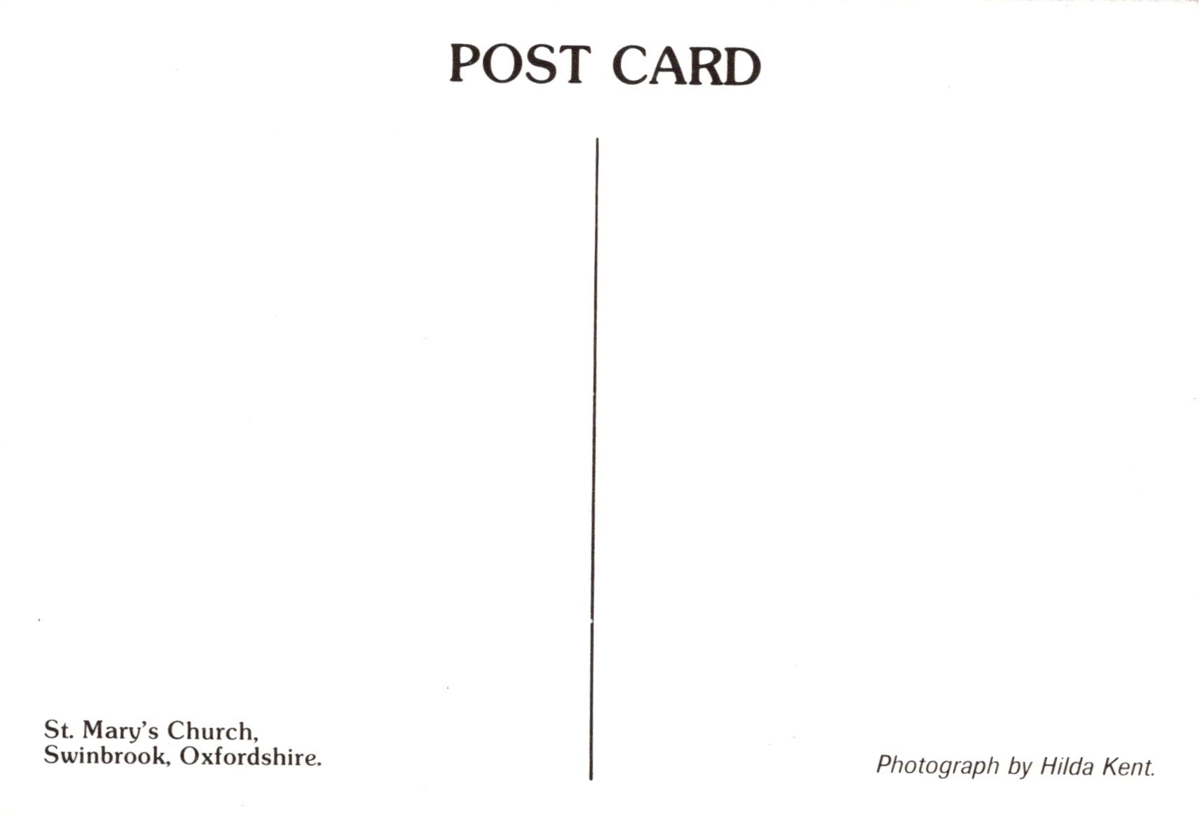 Blank postcard with text about St. Mary's Church, Swinbrook, Oxfordshire, and a photograph by Hilda Kent.