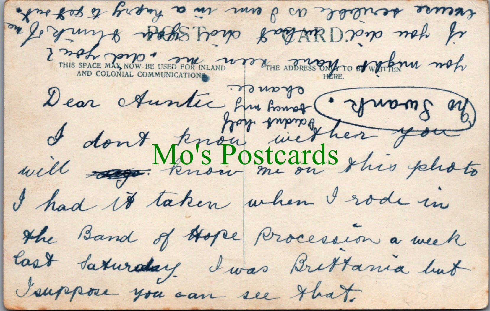 All of our postcards are posted to you inside a plastic sleeve and a board backed envelope which will be marked 'Please do not bend'. The 'Mo's Postcards' watermark does not appear on the actual postcard'.
