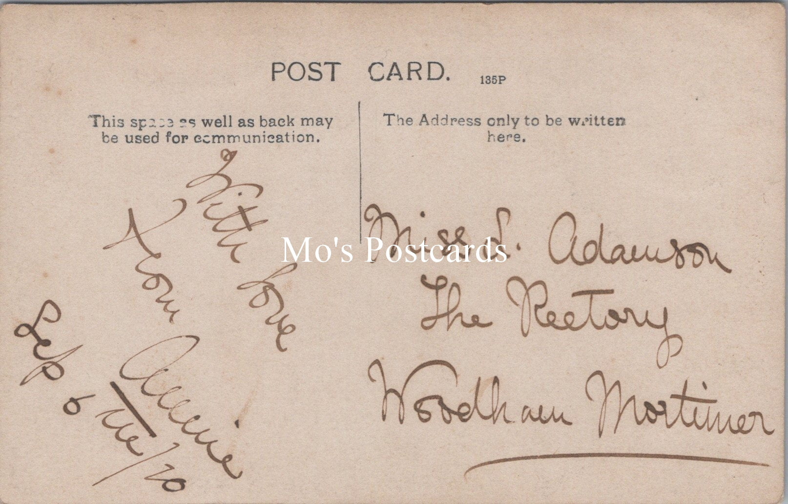 Postcard size: Standard. Addressed to Miss L.Adamson at The Rectory, Woodham Mortimer