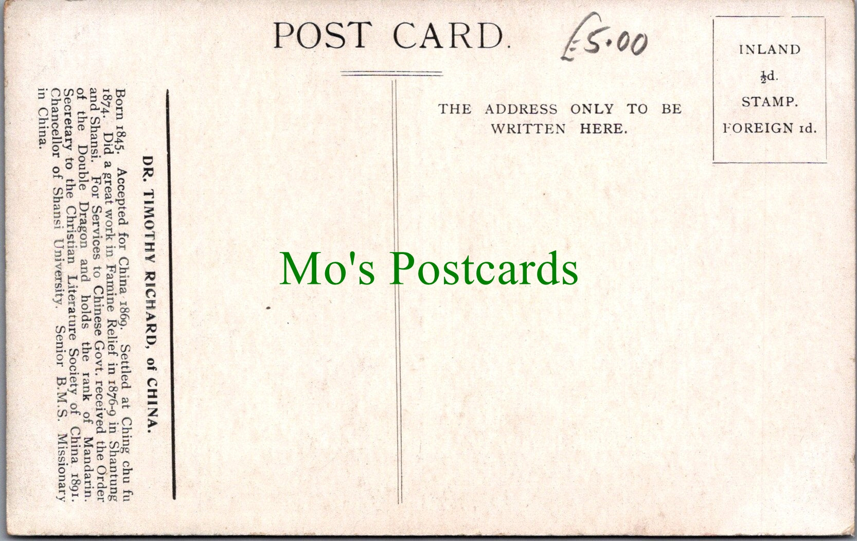 Dr Timothy Richard of China. This is a fantastic standard sized postcard which would be a great addition to your postcard collection.
