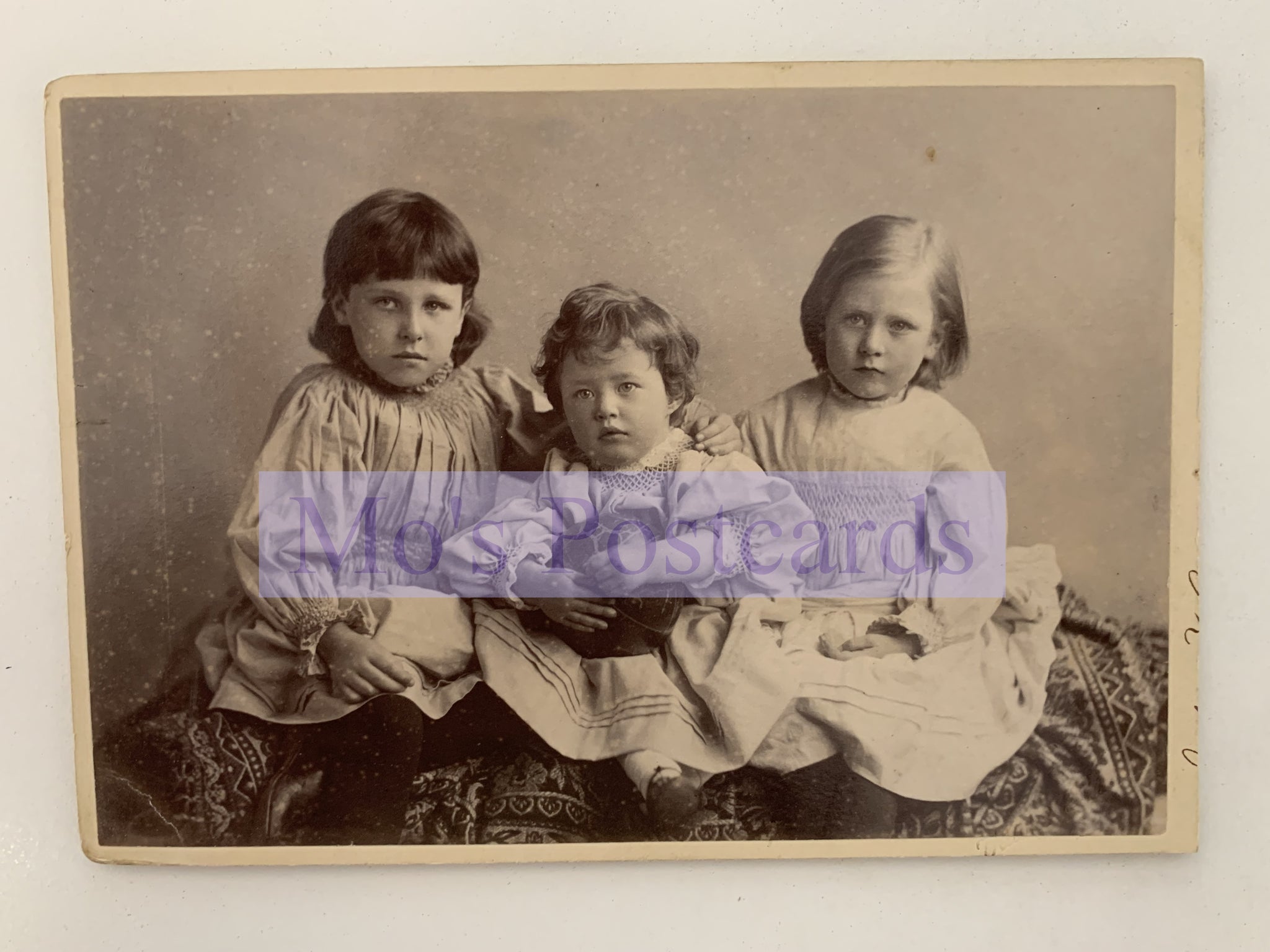 This is a Victorian Cabinet Card - 1888 Portrait of Three Children. One Holding a Football. All three children named on the back of the cabinet card. Connie, Dorothea, and Lilly Davies. Taken June 1888 - CBC20
