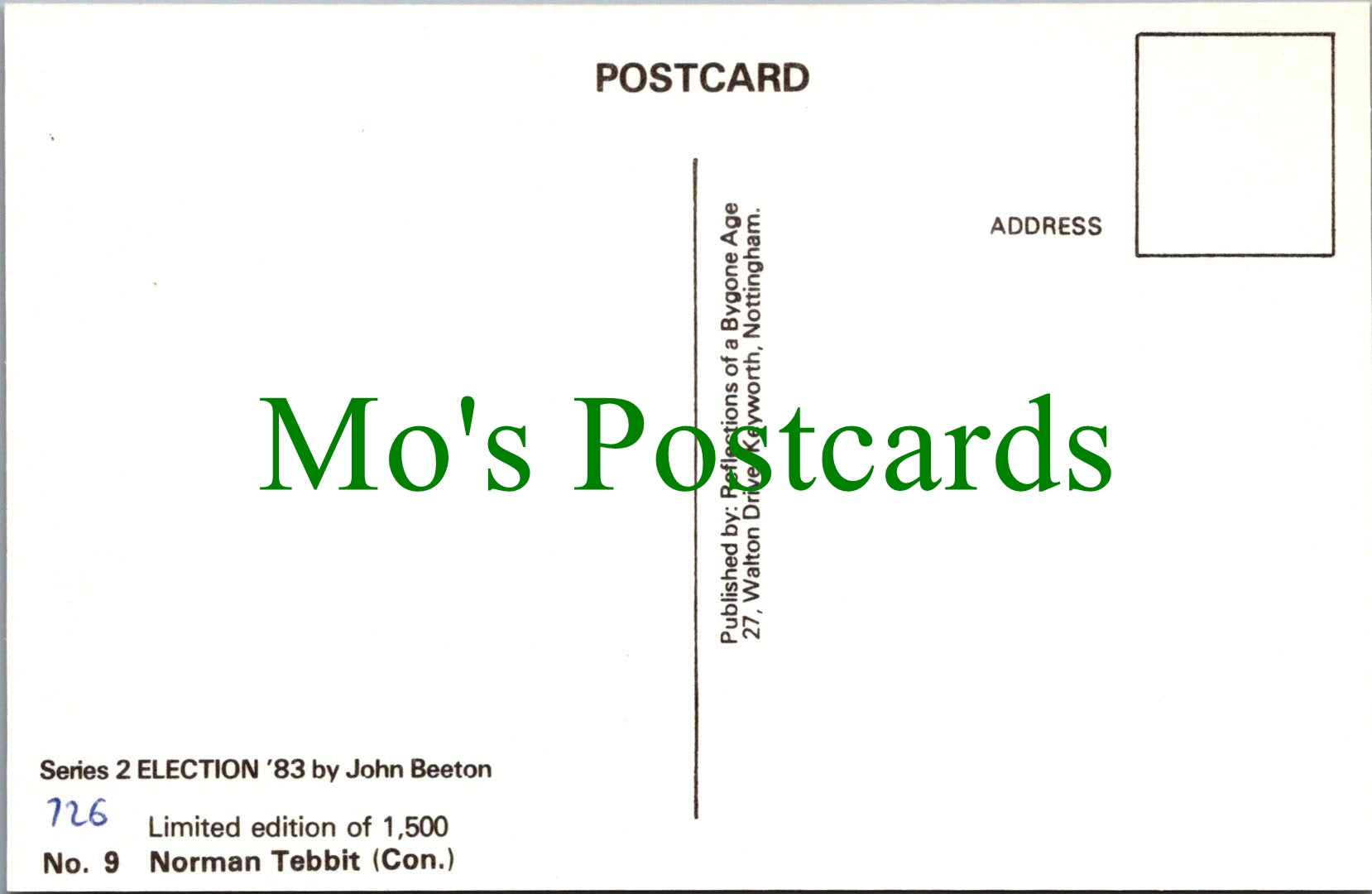 All of our postcards are posted to you inside a plastic sleeve and a board backed envelope which will be marked 'Please do not bend'. The 'Mo's Postcards' watermark does not appear on the actual postcard'.
