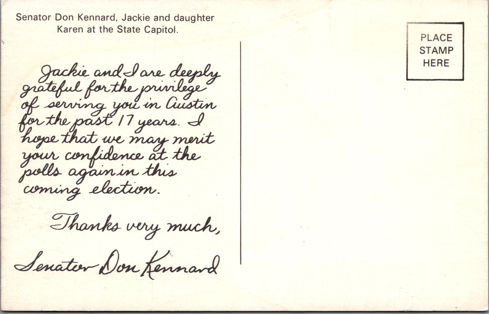This is a Politics Postcard - Senator Don Kennard, Jackie and Daughter Karen at The State Capitol  SW17456