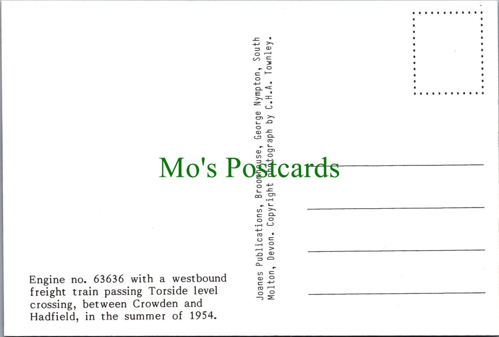 This is a postcard of Engine No.63636 Passing Torside Level Crossing, Between Crowden and Hadfield in 1954.