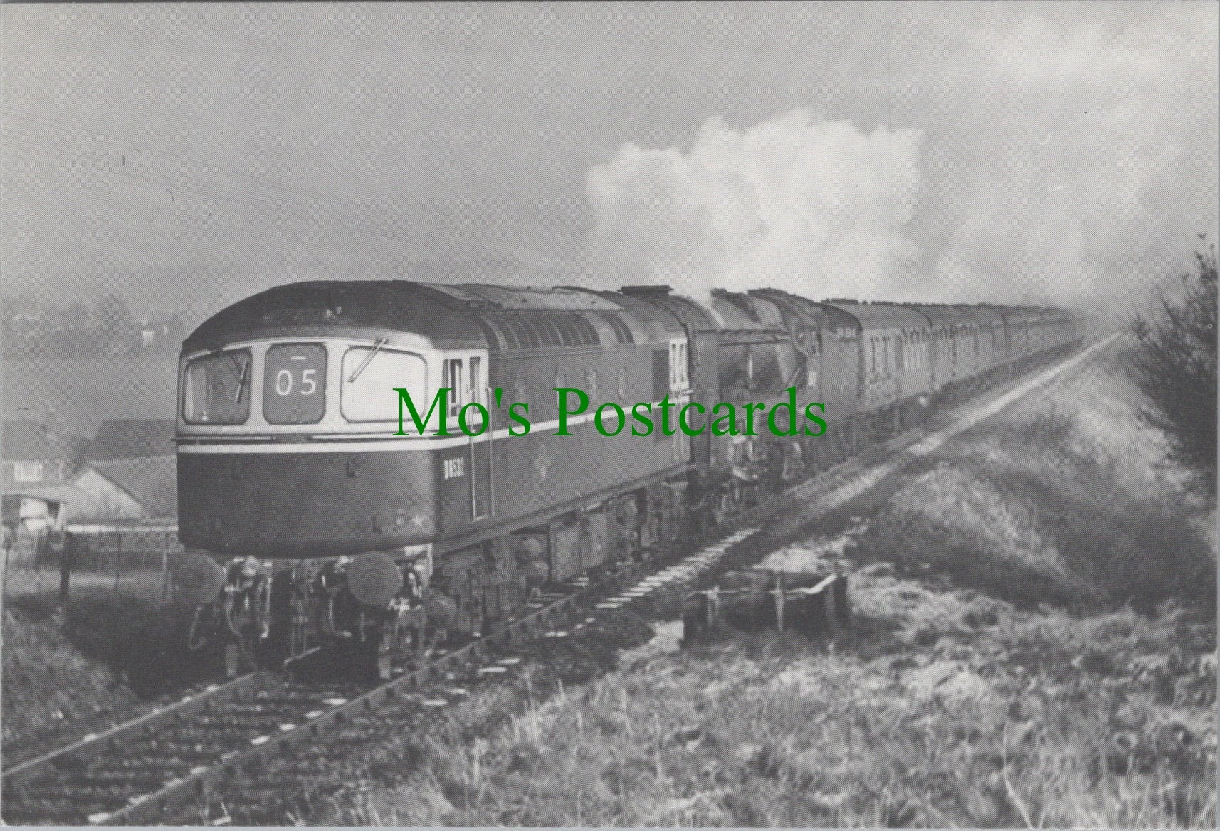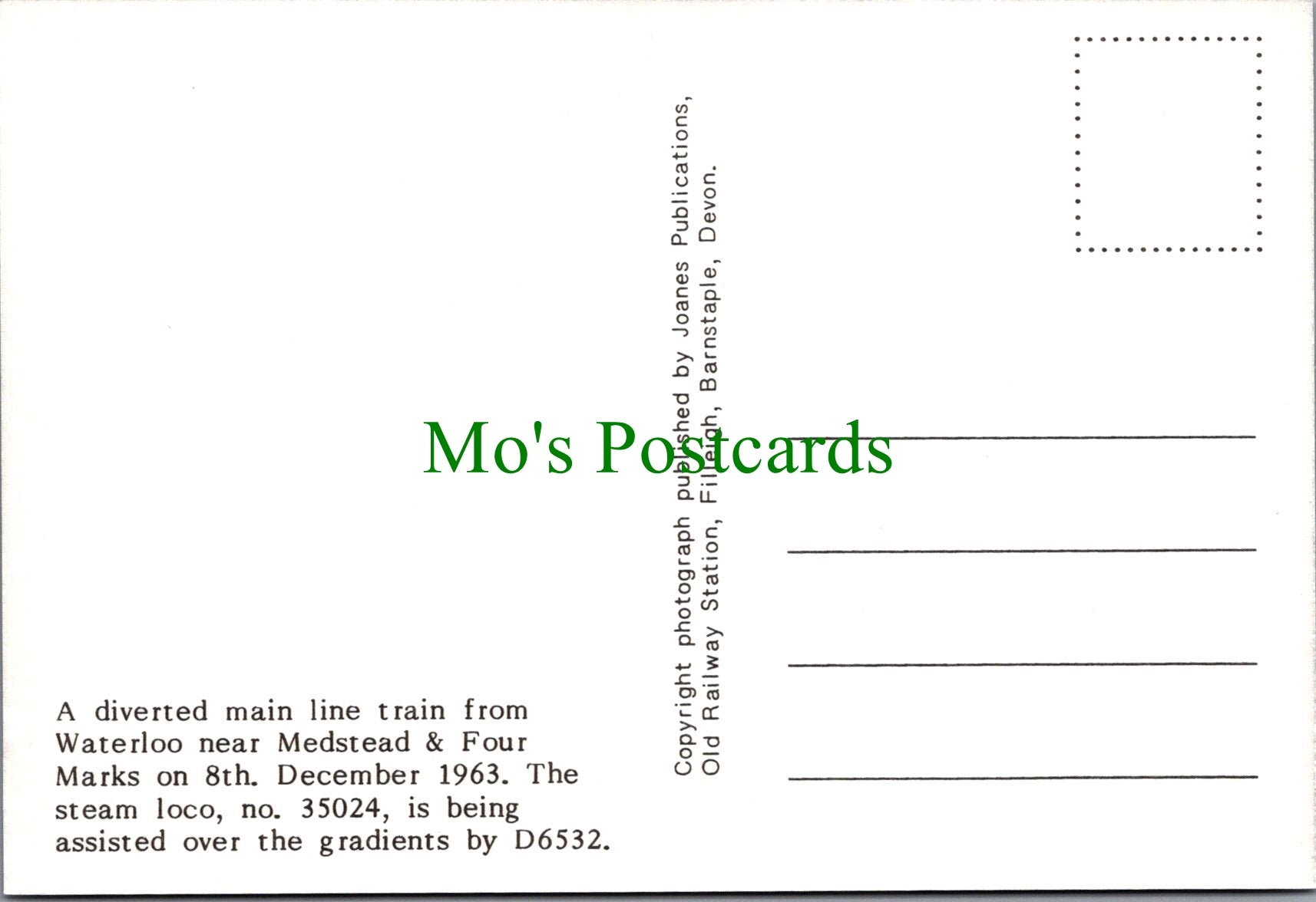 Railways Postcard - Train Near Medstead. A diverted main line train from Waterloo near Medstead & Four Marks on 8th December 1963. The steam loco no.35024 is being assisted over the gradients by D6532.