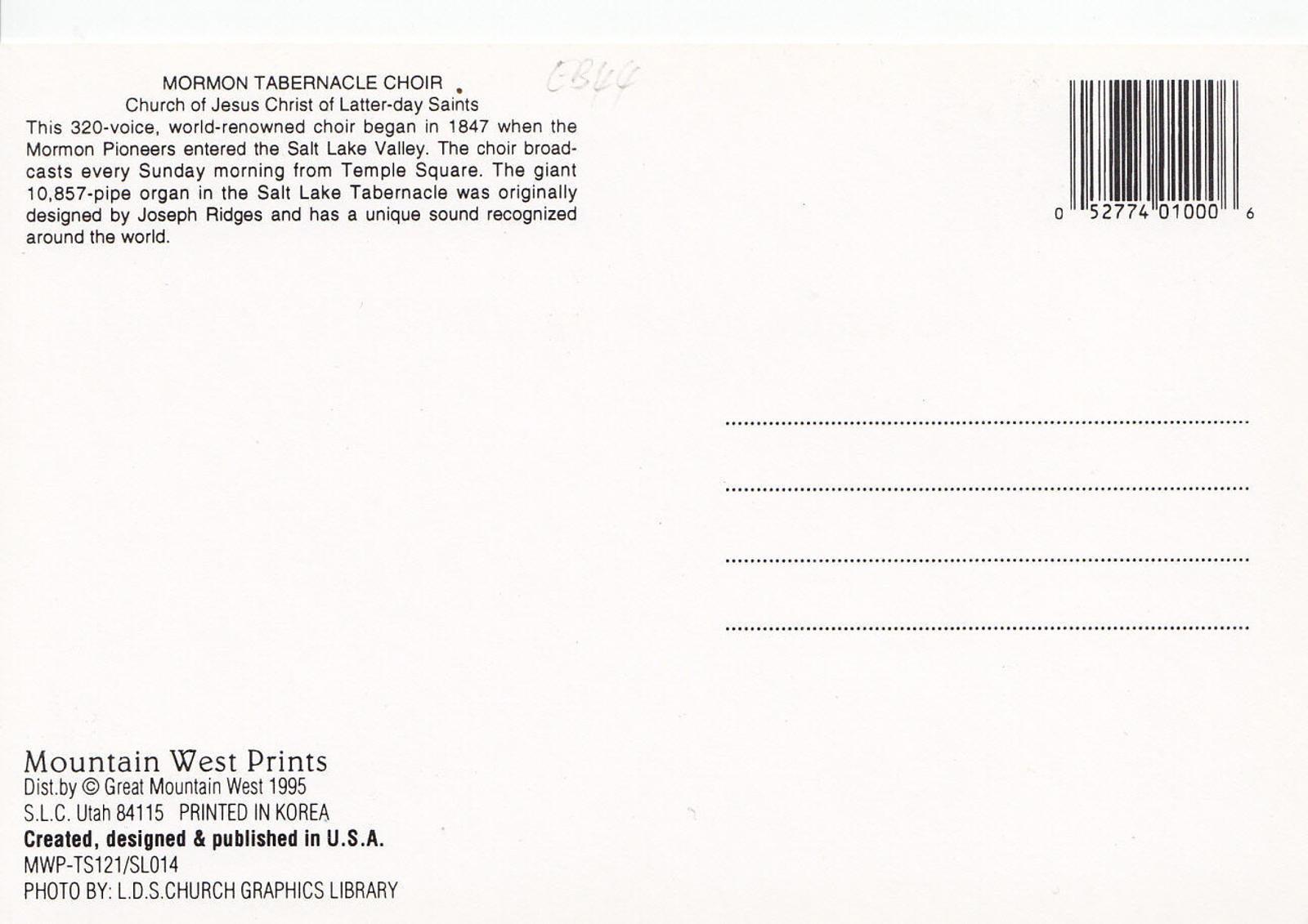 Religion Postcard - Mormon Tabernacle Choir EB44
