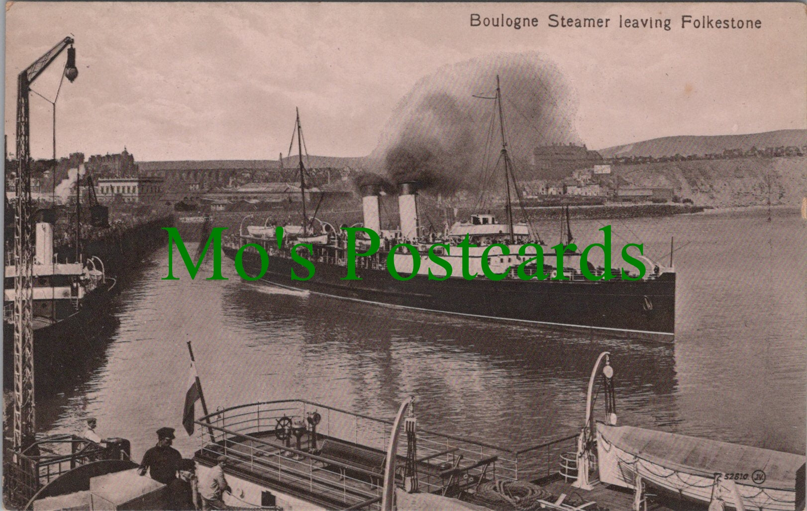 This is a postcard of Boulogne Steamer Leaving Folkestone, Kent