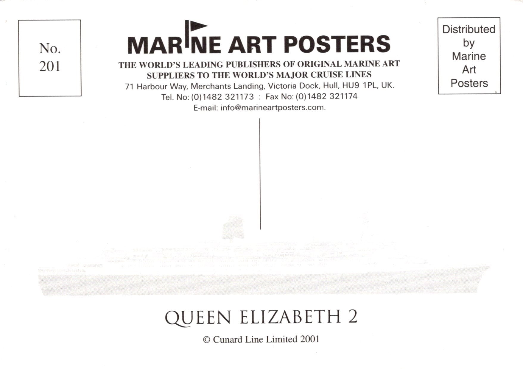 Marine Art Posters branded card with 'Queen Elizabeth 2' and contact information.