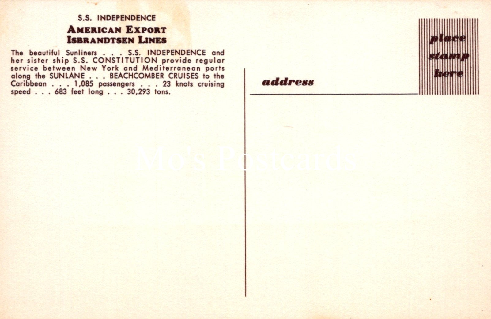 Mo's Ref: Shipping Postcard - S.S.Independence, American Export Isbrandtsen Lines SW18704