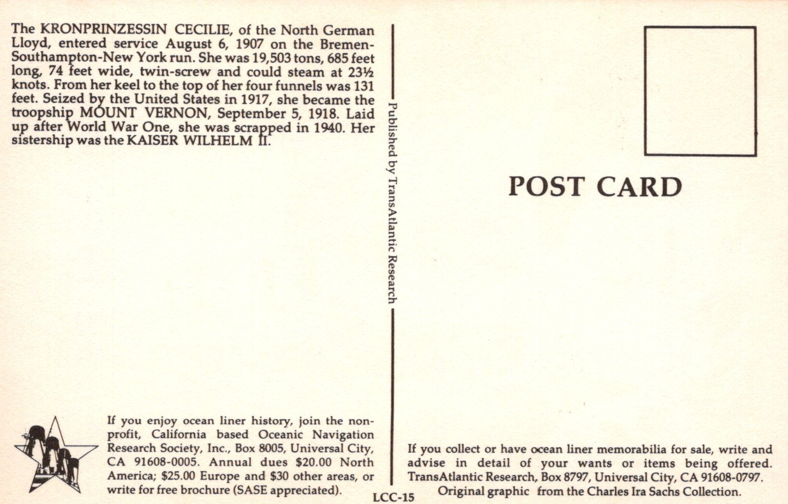Back of a postcard with text about ocean liner history, featuring a small graphic of a ship.