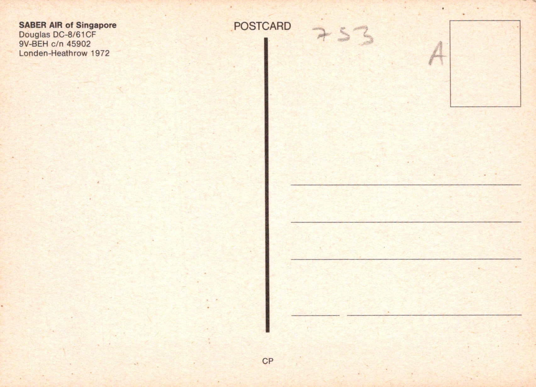 Aviation Postcard - Saber Air of Singapore Douglas DC-8/61CF Aeroplane, London Heathrow, 1972 - Mo’s Postcards