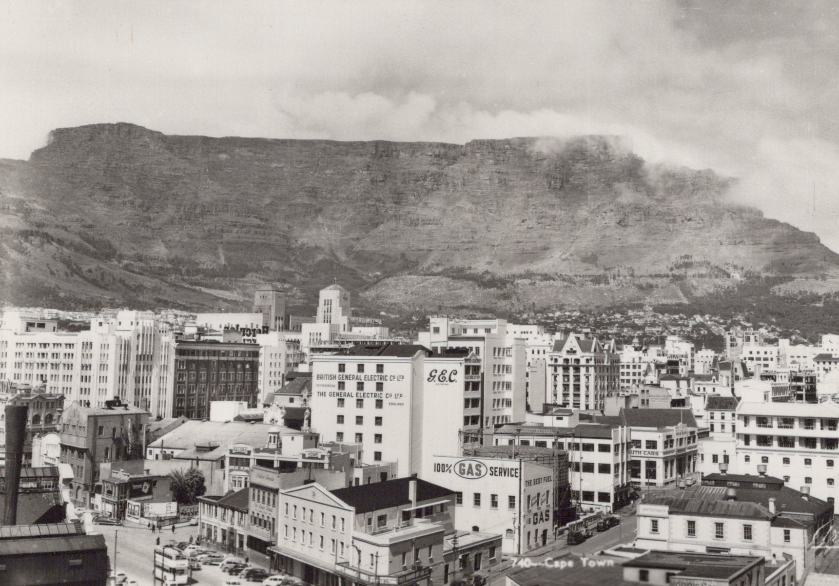 Vintage black and white photo of a cityscape with Table Mountain in the background