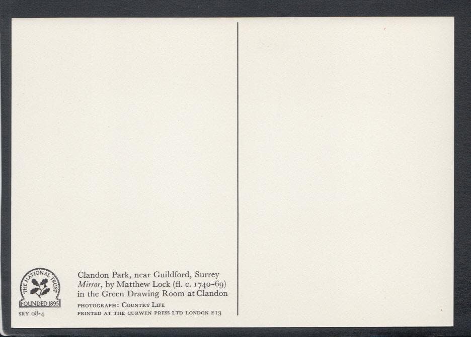 Mo's Postcards offers for sale a postcard of Clandon Park, Near Guildford, Surrey. Mirror, By Matthew Lock in The Green Drawing Room.