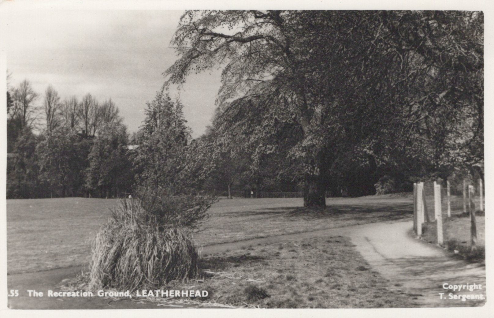 Black and white photo of a park with trees and a path, labeled 'The Recreation Ground, Leatherhead'.