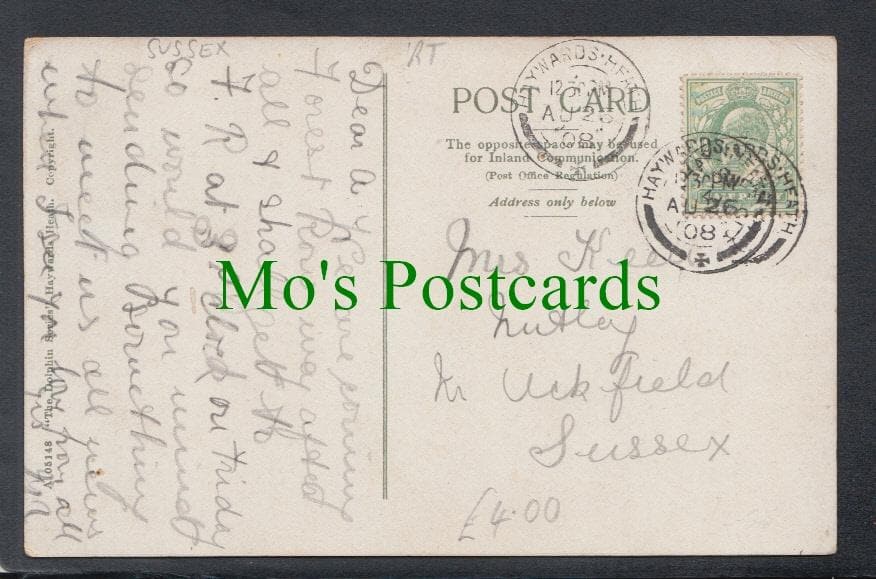 Standard size postcard. Posted in 1908. Slight wear to the top left hand corner.