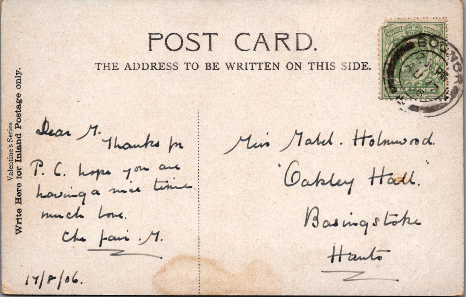 Postcard size:  Standard. Posted in 1906