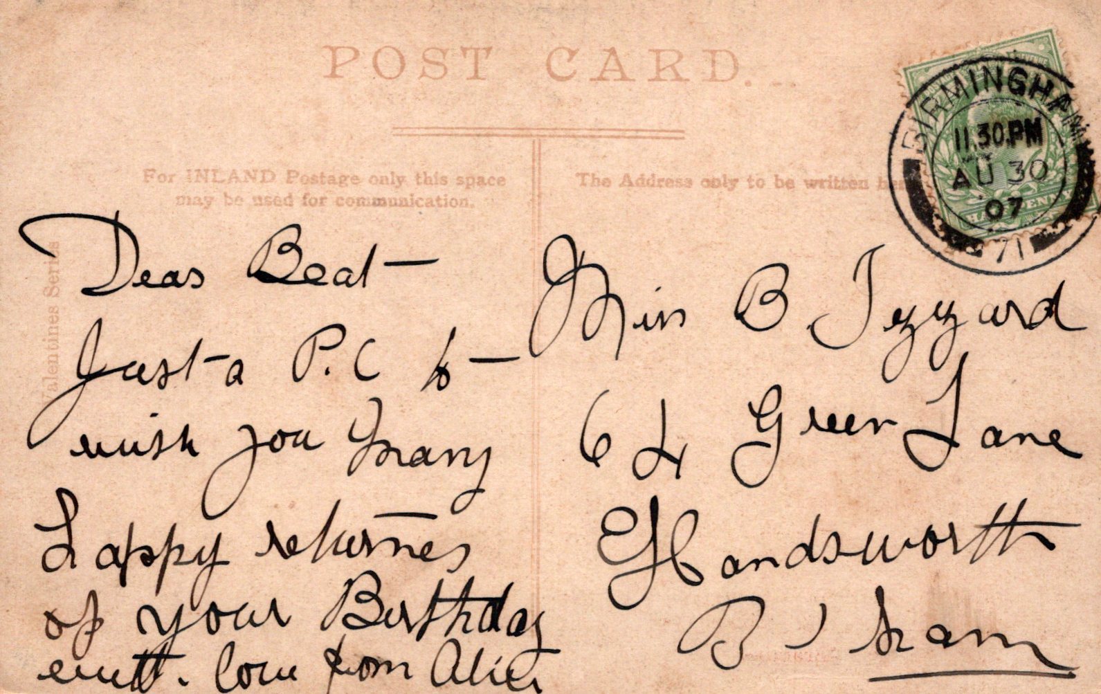 Postcard size: Standard. Posted in 1907