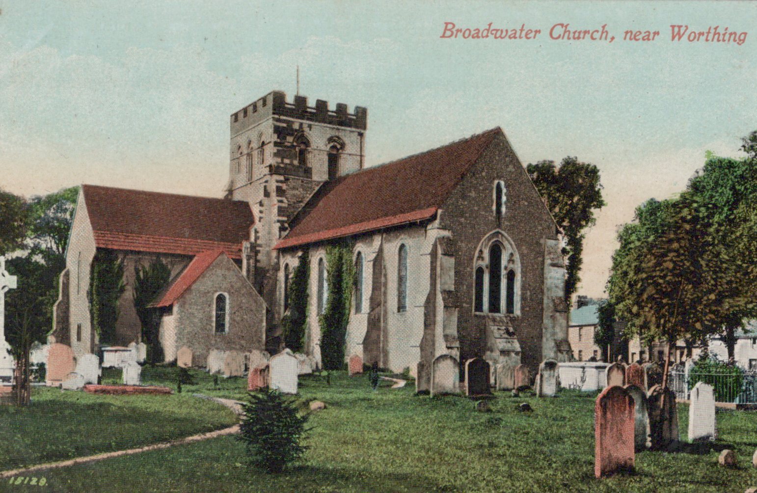 Vintage postcard of Broadwater Church near Worthing with a church and graveyard.