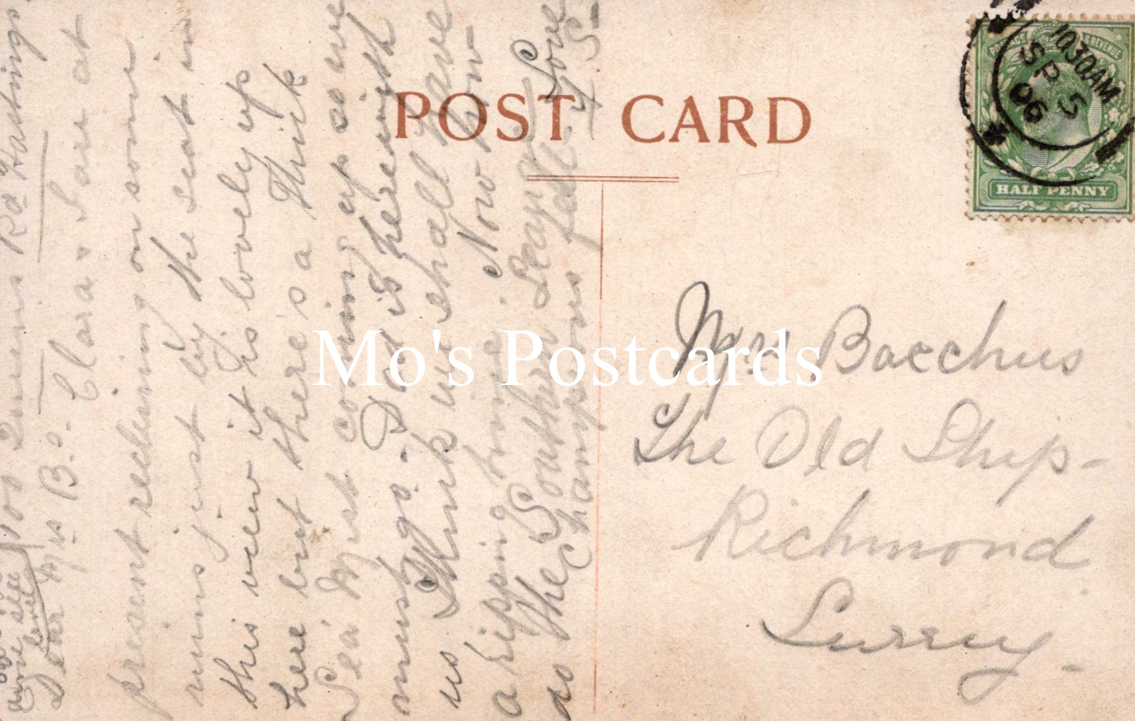 • Load image into Gallery viewer, Vintage postcard with handwritten text and a stamp, featuring the brand 'Mo's Postcards'.