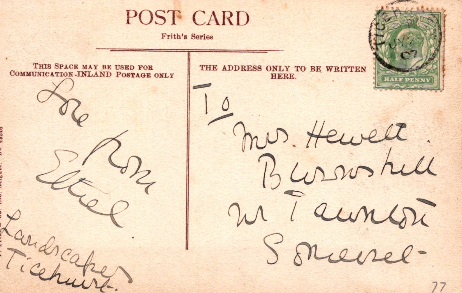 Postcard size:  Standard. Posted in 1907