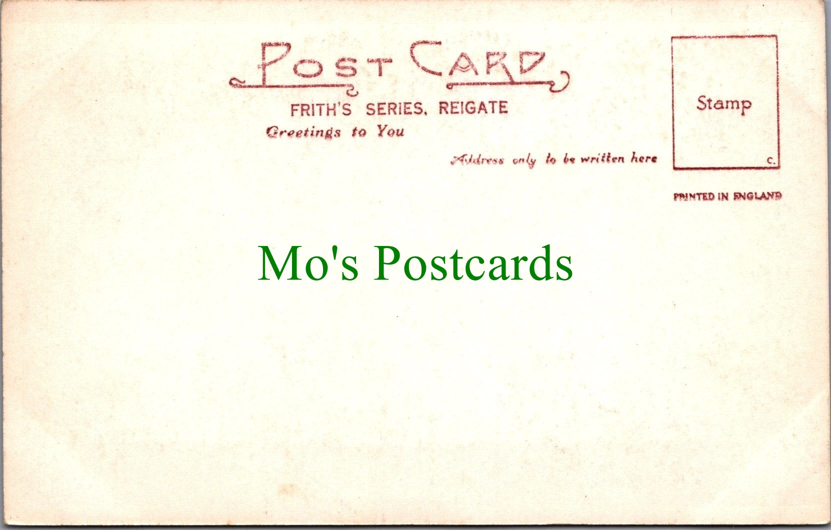 All of our postcards are posted to you inside a plastic sleeve and a board backed envelope which will be marked 'Please do not bend'. The 'Mo's Postcards' watermark does not appear on the actual postcard'.