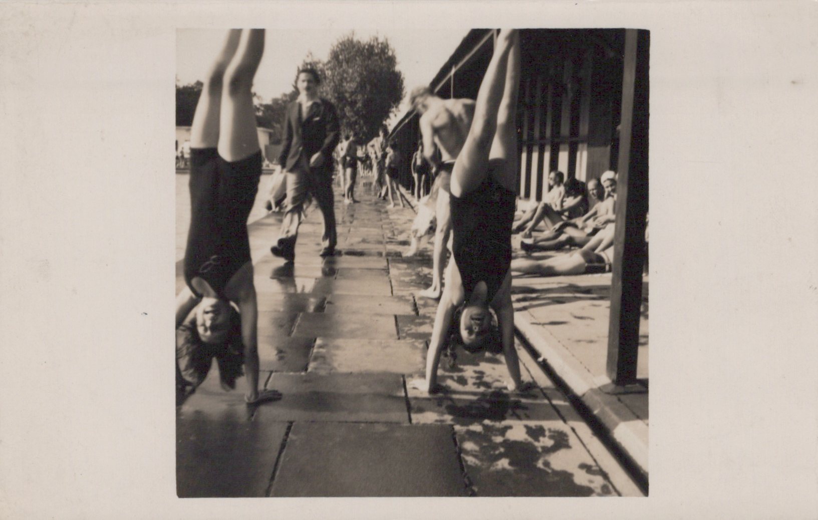 • Load image into Gallery viewer, Two people doing handstands on a wooden deck with other people in the background.