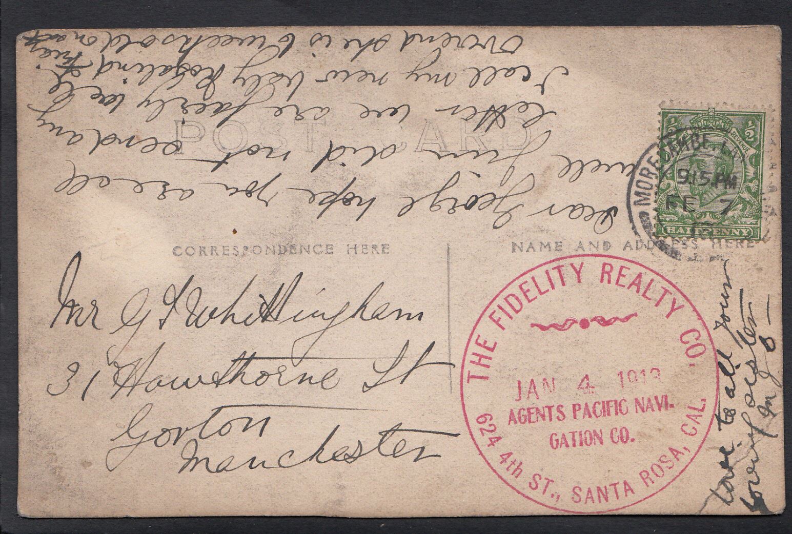 Publisher:   Unknown - But card has a red circular ink stamp with the following information "The Fidelity Reality Co, 624 4th St, Santa Rosa, California - Jan 4. 1913, Agents Pacific Navi, Gation Co."
