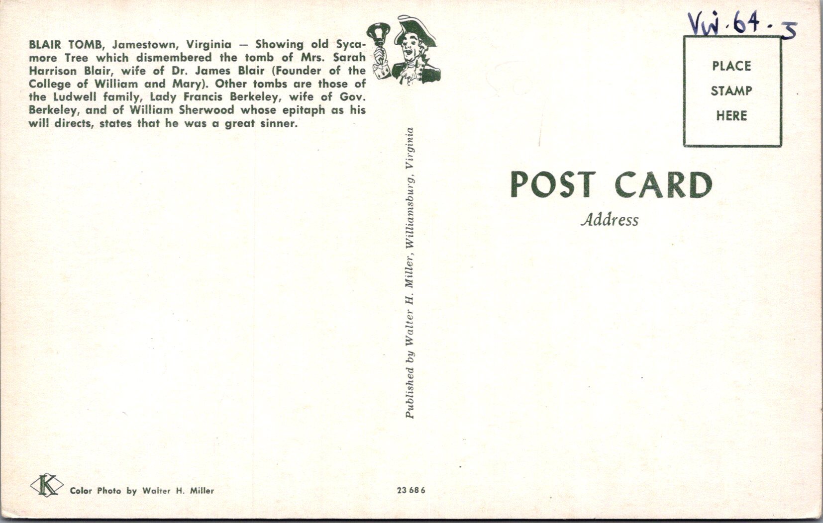 America Postcard - Blair Tomb, Jamestown, Virginia   SW16550