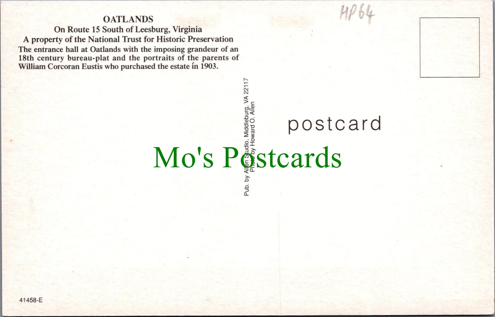 Mo's Ref:  America Postcard - Oatlands, South of Leesburg, Virginia HP64