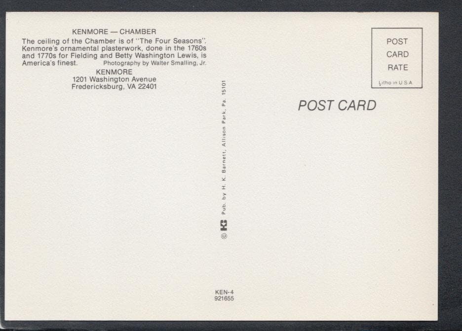 Mo's Postcards offers for sale a postcard of Kenmore, Fredericksburg, Virginia. The Ceiling of The Chamber.