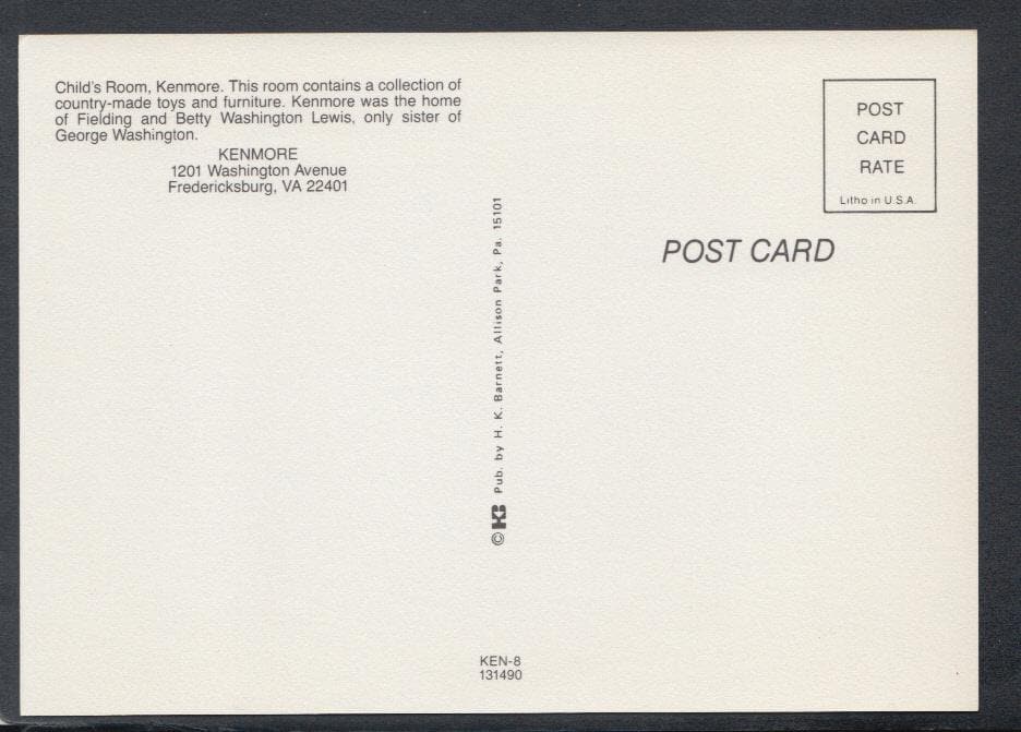 Mo's Postcards offers for sale a postcard of Kenmore, Fredericksburg, Virginia. The Child's Room.