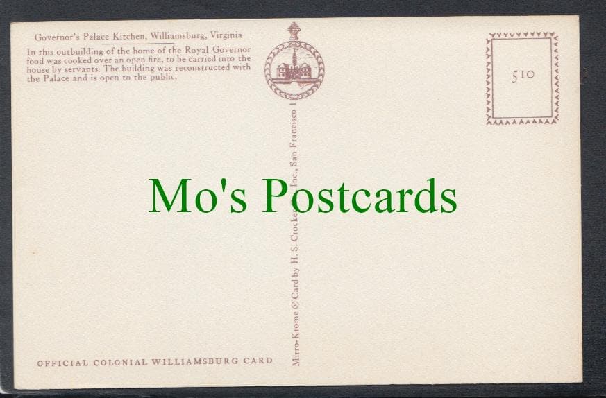 Mo's Postcards offers for sale a postcard of the Governor's Palace Kitchen, Williamsburg, Virginia, America.