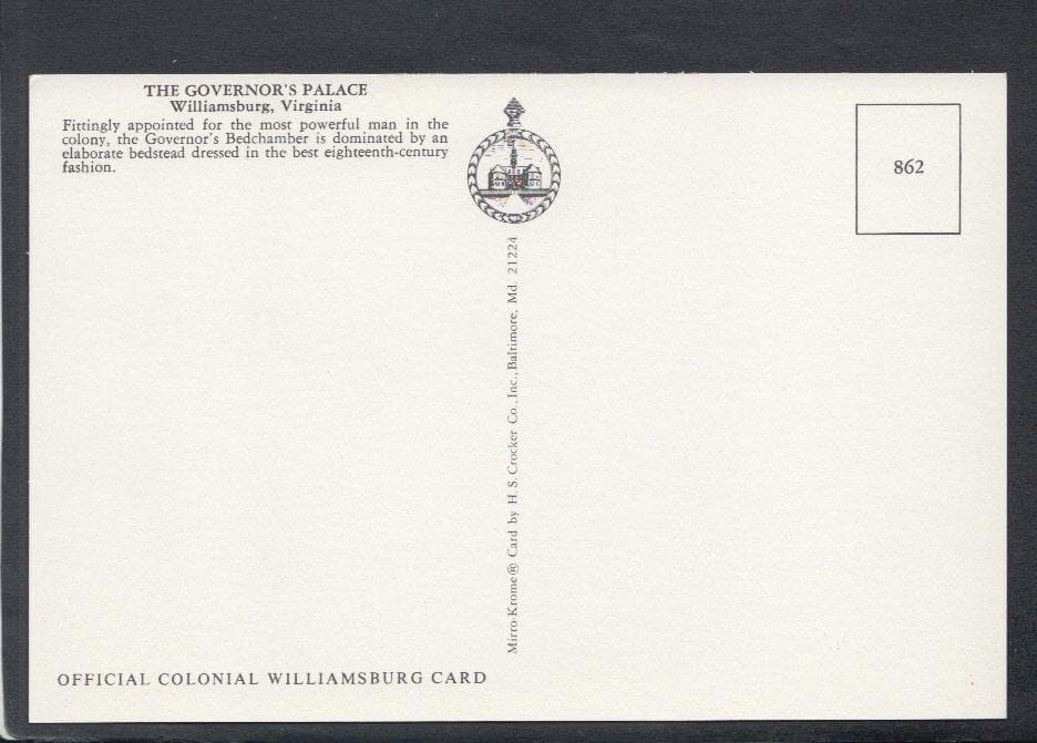 Mo's Postcards offers for sale a postcard of The Governor's Palace, Williamsburg, Virginia. The Governor's Bedchamber.