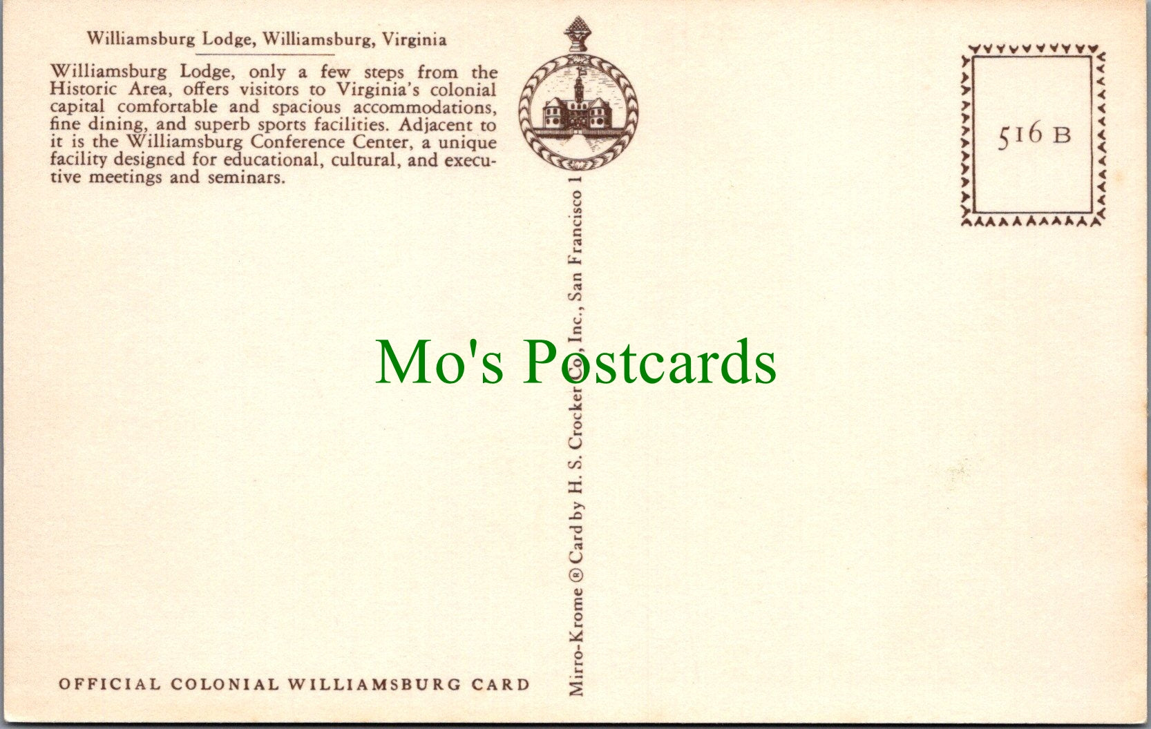 Williamsburg Lodge, Williamsburg, Virginia. This is a fantastic standard sized postcard which would be a great addition to your postcard collection.