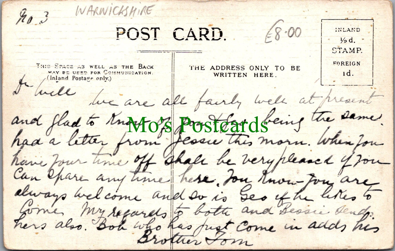 All of our beautiful postcards are posted to you inside a plastic sleeve and a board backed envelope which will be marked 'Please do not bend'. The 'Mo's Postcards' watermark does not appear on the actual postcard'.